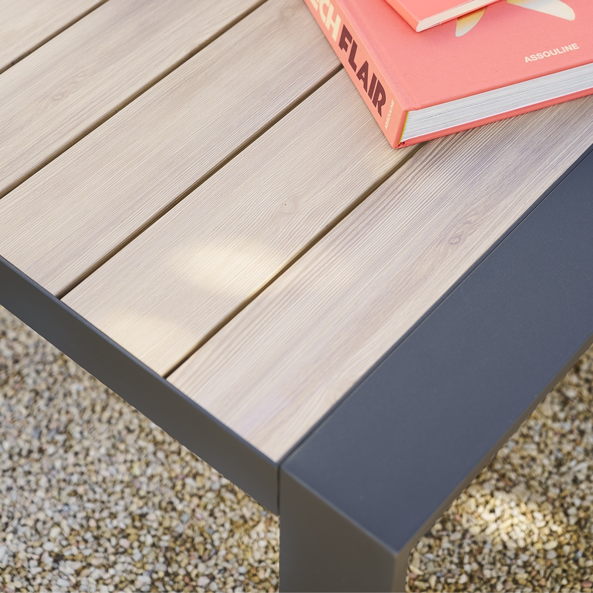 Composé d'un canapé d'angle conçu pour 5 personnes et d'une table basse carrée, le salon "ÉVASION" est une création Hespéride qui se décline dans plusieurs coloris. L'ensemble est réalisé à partir d'une structure en aluminium teinté et la table basse offre un plateau à lattes.